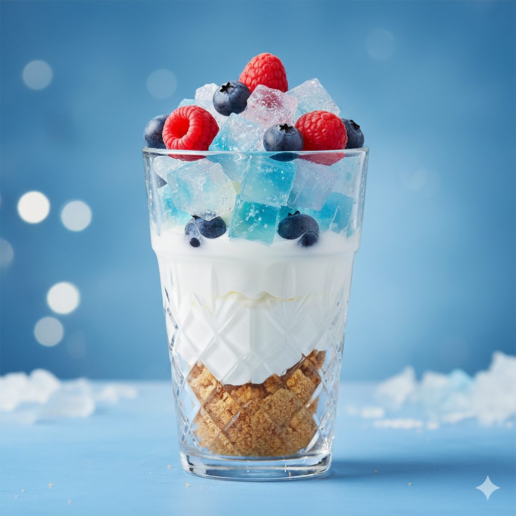 5. [emotional climax]Finish with a generous serving of crushed jelly, topped with mixed berries that evoke the image of a passionate “goal”. Garnish with mint and you have a hot parfait on ice!