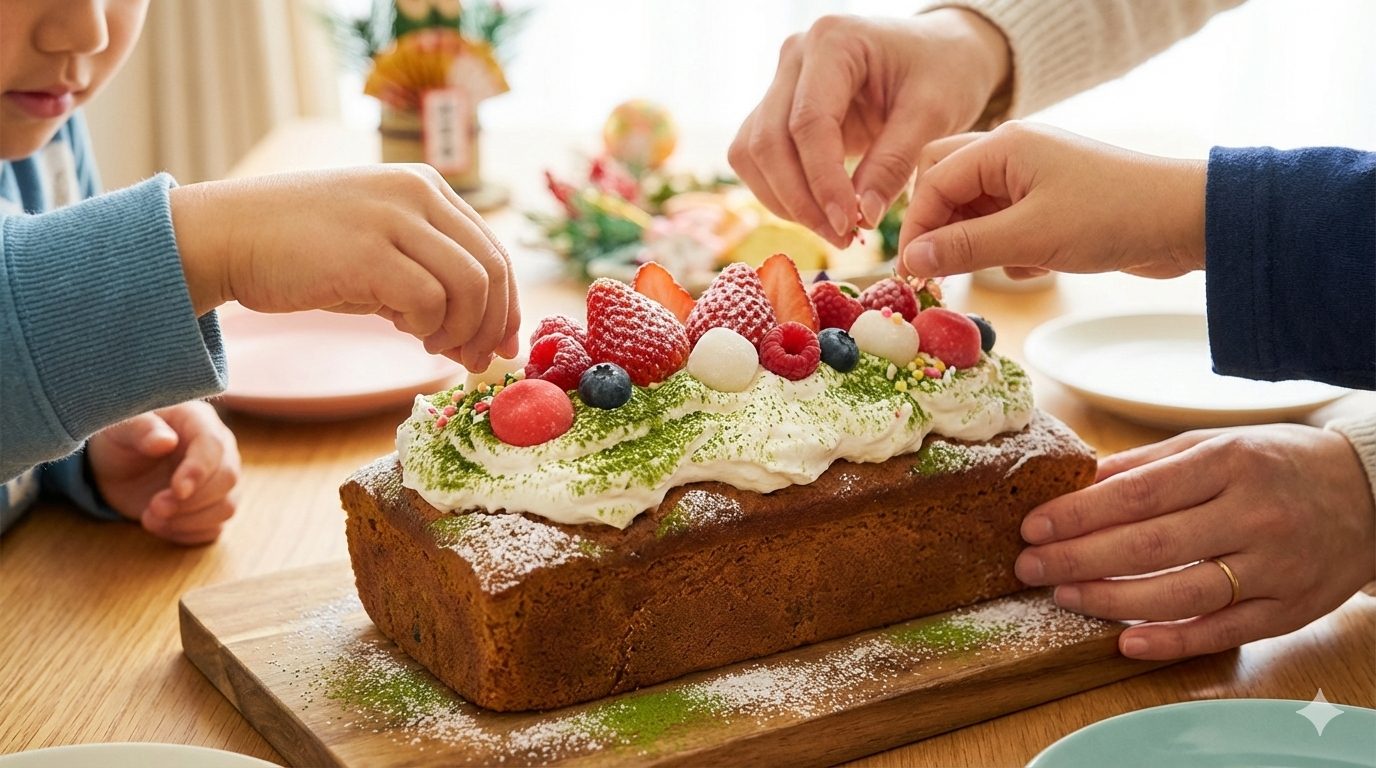 - 冷めたパウンドケーキに泡立てた生クリームをたっぷりと塗り、いちごやラズベリー、ブルーベリーを彩りよく飾りつけます。赤と白、そして緑の抹茶パウダーを少し振れば、まさに紅白のお祝いカラーに!ミニ紅白餅も添えて、お正月らしさを演出しましょう。