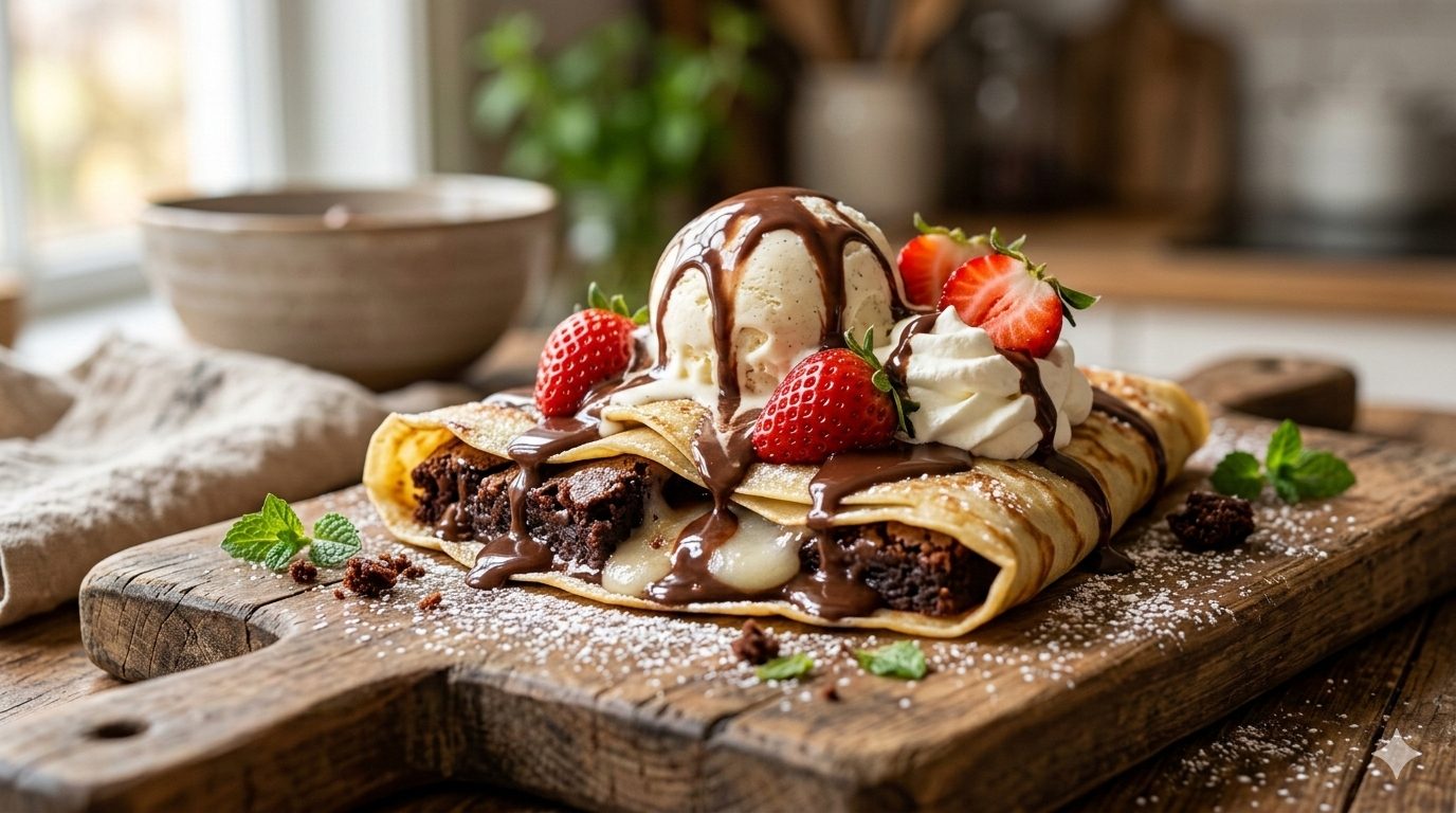 このレシピの最大のポイントは、温かい濃厚ブラウニーと冷たいアイスクリームが口の中で溶け合うコントラストです。ブラウニーは焼きすぎず、しっとりとした食感を残すのがコツ。また、クレープ生地を冷蔵庫でしっかり休ませることで、驚くほどもちもちの食感が生まれます。焼き立てのクレープに温かいブラウニーを乗せることで、香りが一層引き立ち、まさに「リアルな感動」を体験できますよ。