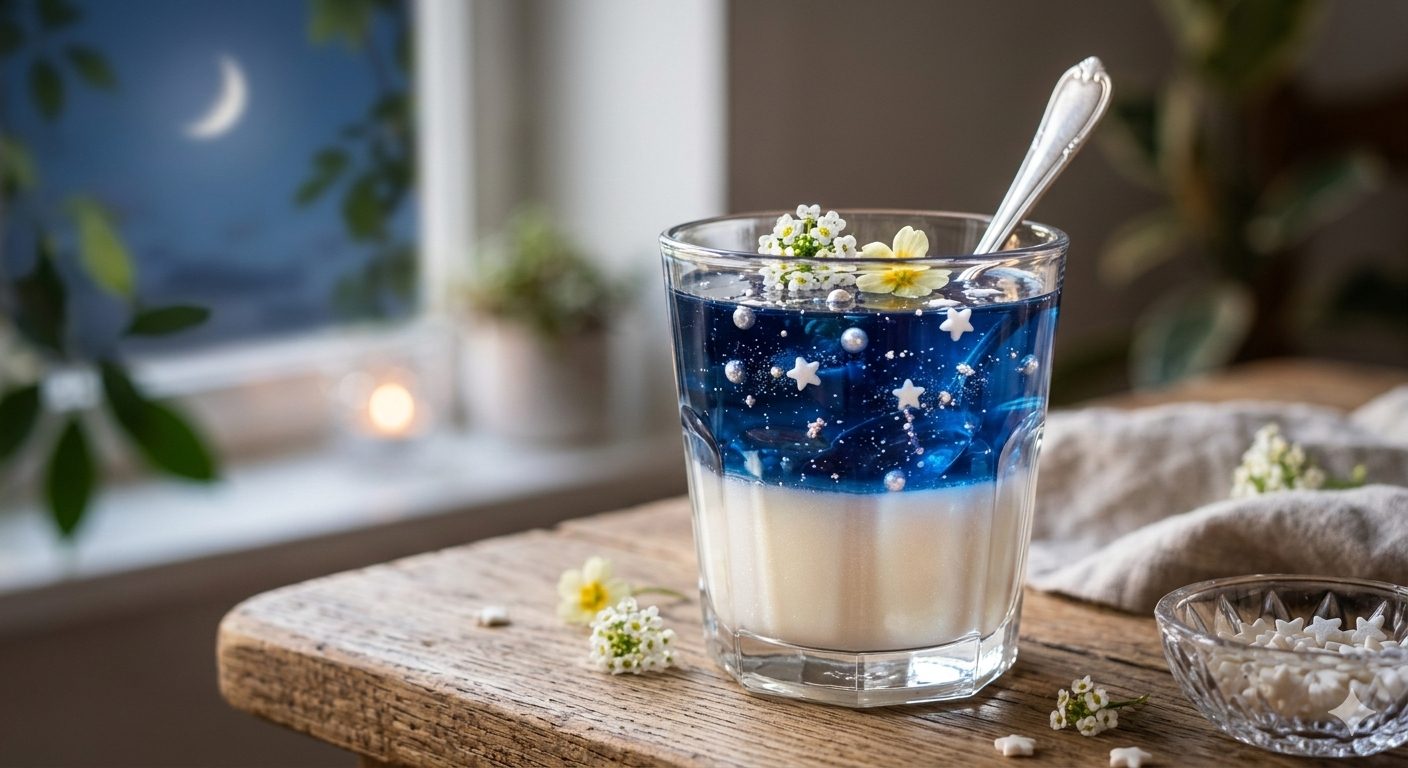 このレシピの最大のポイントは、二層のゼリーを固めるタイミング。下のムーンライト層が完全に固まる前に、上のスターダスト層をそっと注ぎ入れることで、層の境目が自然に混じり合い、神秘的なグラデーションが生まれます。また、アラザンやフリーズドライブルーベリーを散らすタイミングも重要。ゼリー液が少し固まり始めた頃に散らすことで、材料が沈み込まず、夜空に浮かぶ星々のように美しく散らばります。ブルーベリーシロップの量で色の濃淡を調整し、自分だけの美しい夜空を創造してくださいね。
